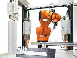 Beneath single system with generator, PCU and plasma nozzle Plasmatreat offers for its customer for test and trial as well as fully equipped PTUs (Plasma Treatment Units). These units can be used for efficient, uncomplicated pretreatment for almost any process. Small, medium and large multi-axis robots within the production cell can be used to transport the components or to move the plasma nozzle around a static assembly. The parts feeding can also be realized optionally via an integrated conveyor belt or a turntable.