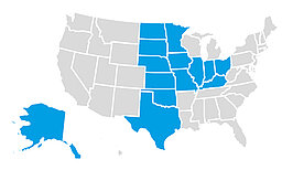 TX, OK, KS, NE, SD, ND, MN, IA, MO, IL, WI, IN, OH, KY, AK